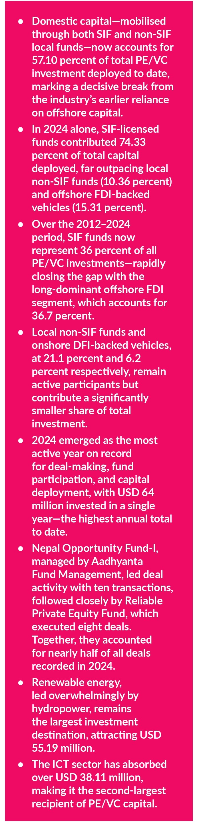 The speed of the transition has been striking. Between 2012 and 2024, SIF-licensed funds accounted for roughly 36% of all PE/VC investment in Nepal—nearly matching offshore FDI-backed funds, which took more than a decade to build their presence.