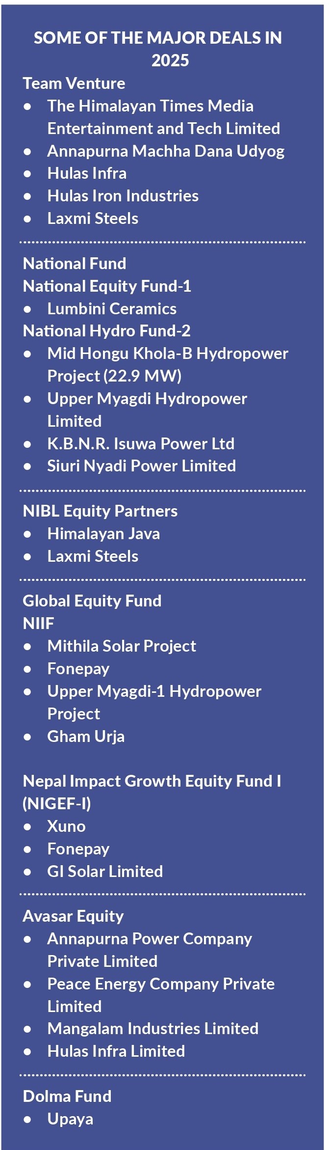 Forty deals were closed during the year, the highest annual figure on record.  Nine funds were active, including three new entrants deploying capital for the first time. Nepal Opportunity Fund–I and Reliable Private Equity Fund together accounted for nearly half of all transactions, underscoring the emergence of anchor investors capable of driving deal flow.