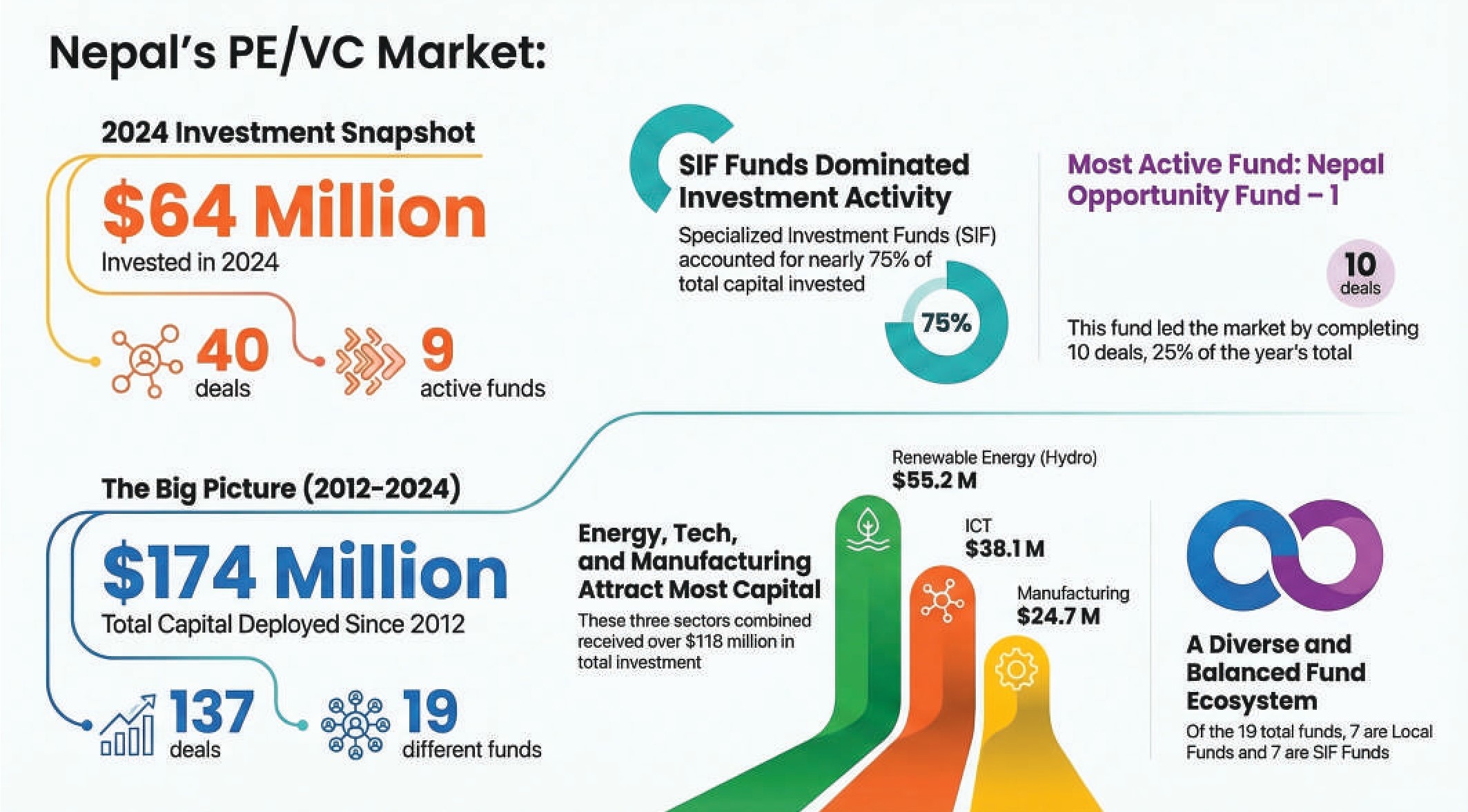 According to the Nepal Private Equity Association’s Market Intelligence Report, PE/VC funds invested $64 million in a single year—the highest annual deployment on record. That figure alone accounted for nearly 40% of all private equity and venture capital investment made in Nepal since 2012. Forty deals were closed during the year across nine active funds, three of which were deploying capital for the first time.