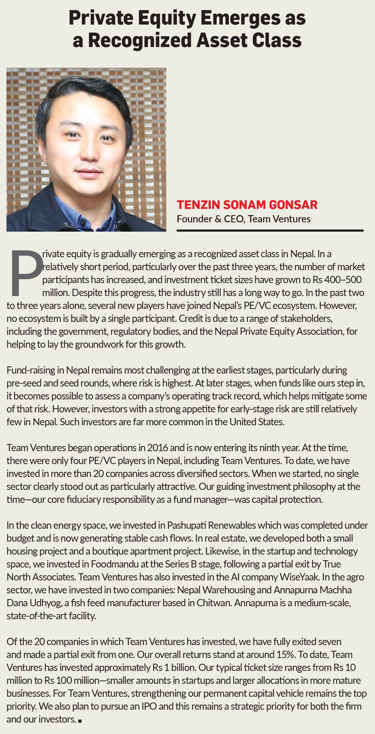 “When Dolma Fund and Business Oxygen entered the market, private equity formally arrived in Nepal,” Thapa says. “They didn’t just invest capital; they established the very concept of private equity.”