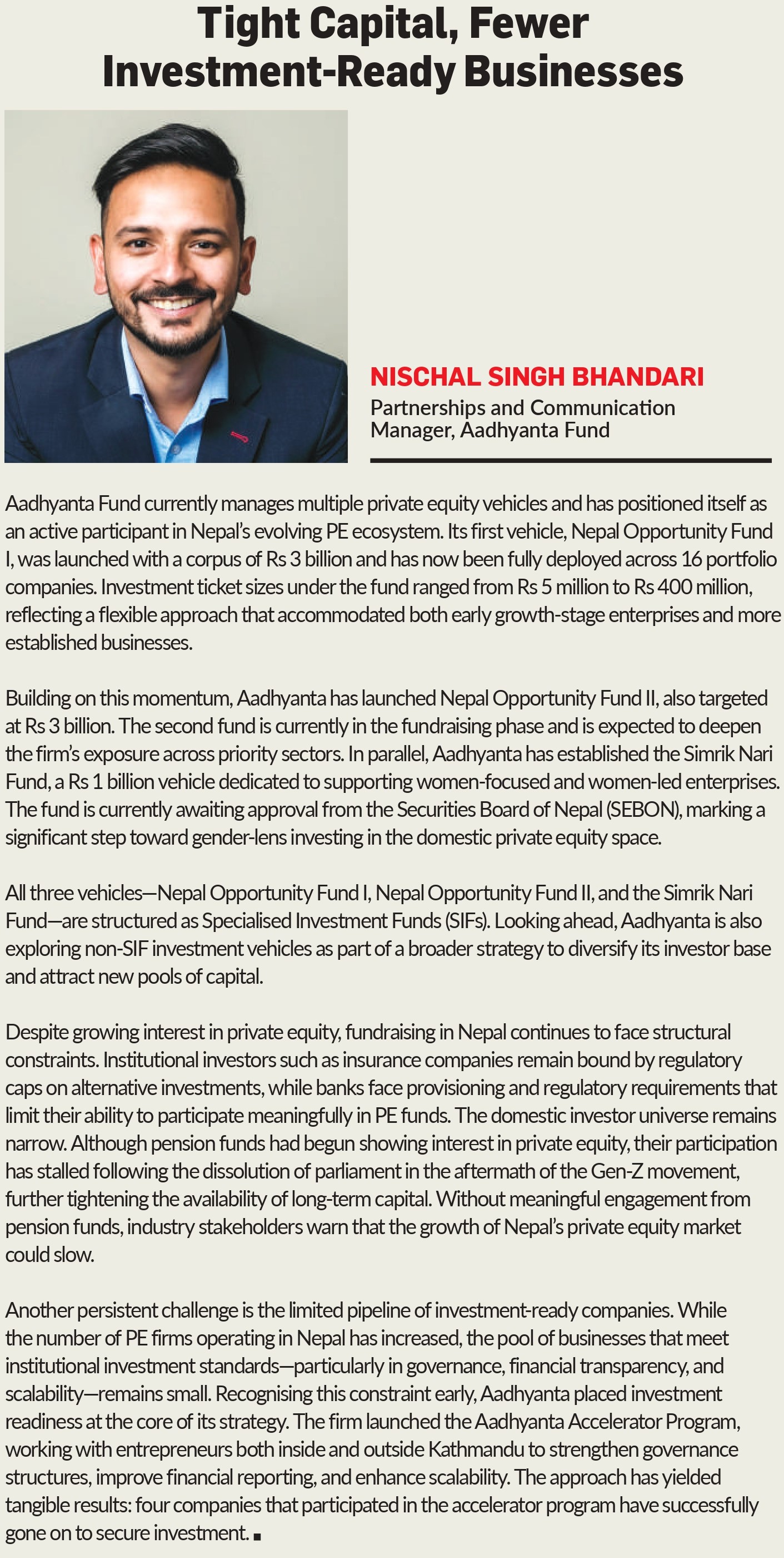 “After 2022, the number of funds, the size of their funds, and the volume of investments increased sharply,” Thapa says. “Today, Nepal’s domestic private equity market has raised around NPR 20 billion.”