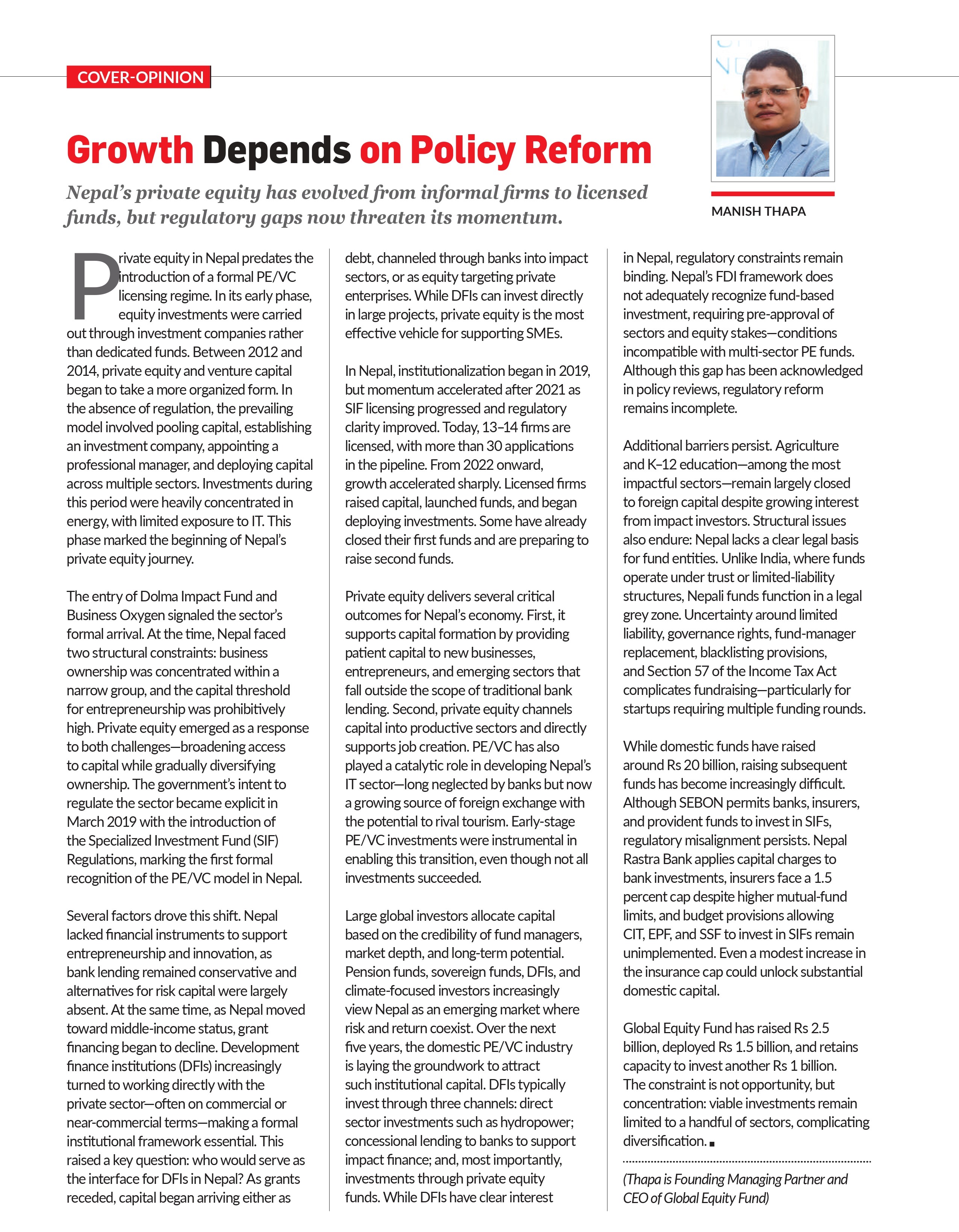 “If we look at the history of private equity in Nepal, before there was a formal PE/VC licensing regime, these activities  existed mainly through investment companies,” says Manish Thapa of Global Equity Fund. “From around 2012, private equity and venture capital began to take shape in a more organized manner, but there was no regulation.”