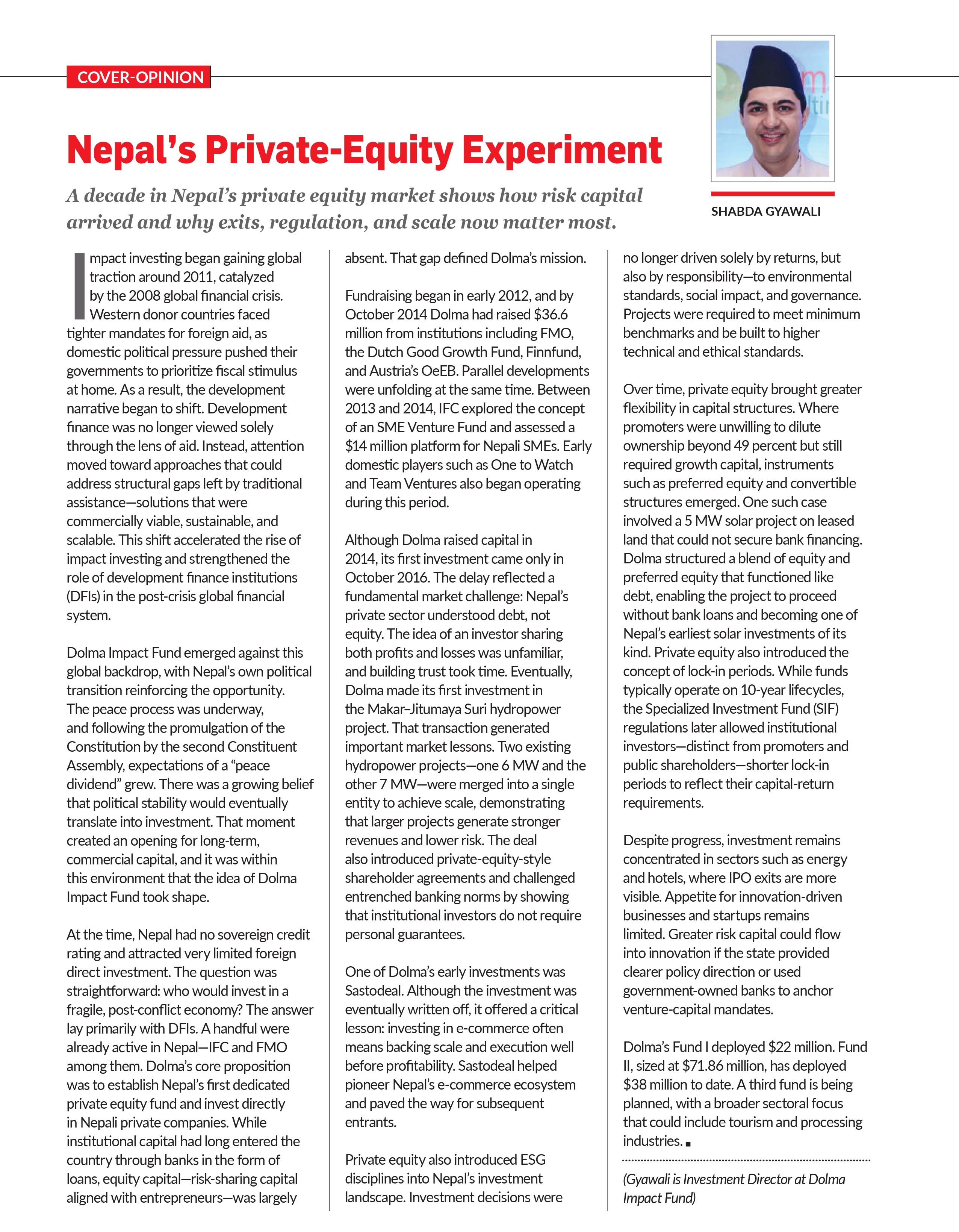 Dolma Impact Fund’s experience illustrates both the promise and the limits of Nepal’s early private equity experiment. Fundraising began in 2012, and by 2014 Dolma had raised $36.6 million from European development finance institutions. Yet its first investment came only in 2016.