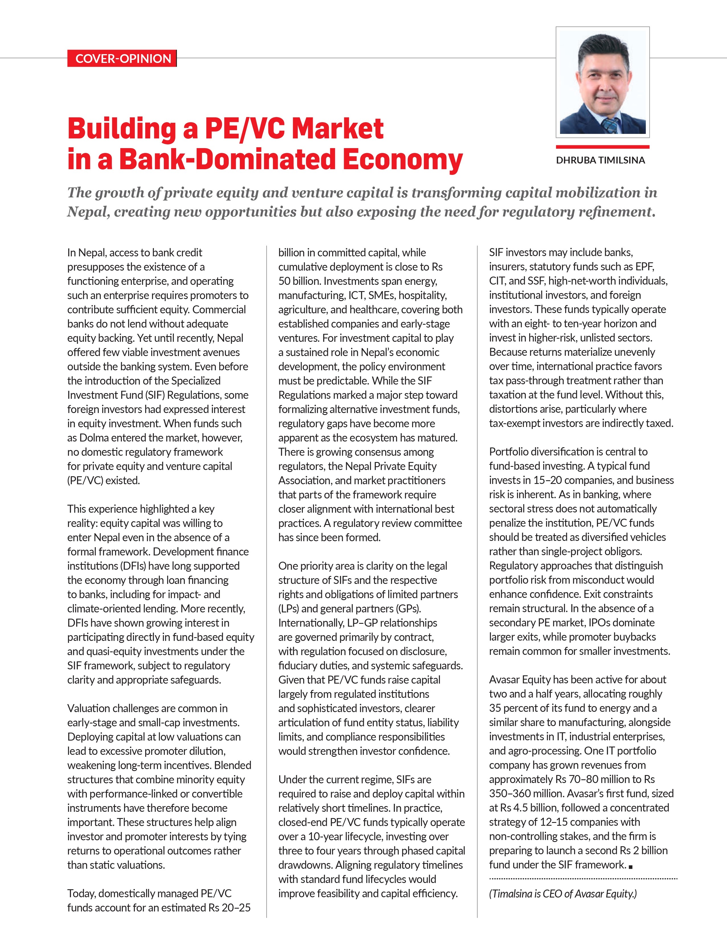 “The growth we’re seeing reflects regulatory clarity and institutional participation,” says Timilsina of Avasar Equity. “Bank credit alone cannot finance growth.”